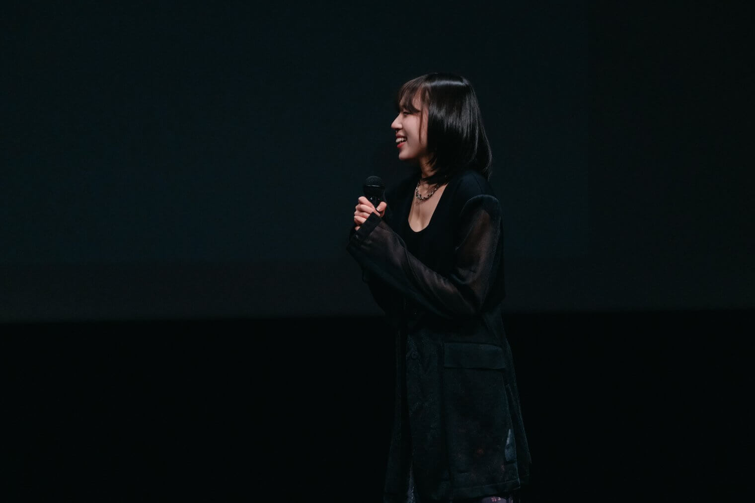 観客は伸びやかな歌声に酔いしれました。歌唱後、十明さんは「緊張したけど、心地よく歌えました。この場で歌うことができてよかったです」と笑みを浮かべ、行定監督が「十明さんの歌声を聞けてすごくうれしい一日になりました。映画『楓』は十明さんの曲も重要なポイントになっているので注目してください。十明さんはいつか女優もするかもしれないね」と話すと、十明が「使ってください」とアピールし、会場は笑いに包まれました。